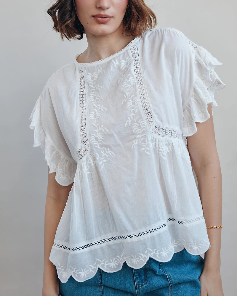 This airy top is all about effortless charm, with delicate embroidery, flutter sleeves, and pretty lace accents that feel light as a breeze. Easy, flowy, and endlessly wearable, it’s your go-to for looking polished while staying perfectly comfortable.