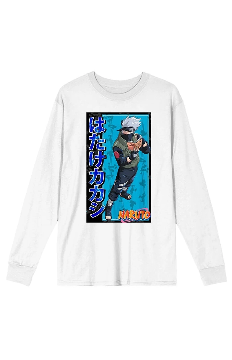 online only! hit the books with your favorite shinobi and this naruto tee. the shirt features an image of kakashi standing reading a book in front of a light blue background while vertical blue kanji letters appear next to the anime character. the tee comes in a white long sleeve crew neck. naruto fans will love to celebrate the series with this comfy and cozy shirt.