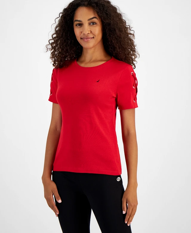 Nautica Jeans Women's Crewneck Lace-Up-Sleeve Cotton T-Shirt