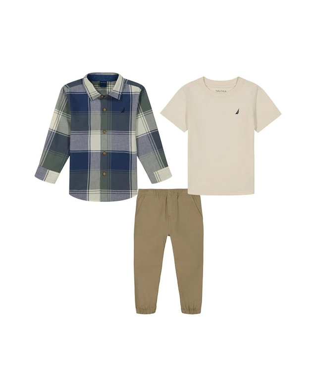 Nautica Toddler and Little Boy T-shirt, Box Plaid Long Sleeve Shirt Twill Joggers Set