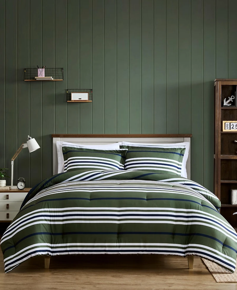Get back to school ready this year with Nautica's Uphaul Stripe comforter set. Making it easy to transition into the dorm with a varying weight of stripes in white and navy on a dark green ground. The brushed microfiber is designed for a relaxed and casual at home feel.