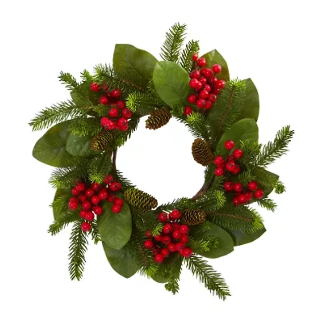 Nearly Natural 19in. Magnolia Leaf; Berry And Pine Wreath