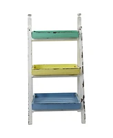 A weathered frame holds a trio of pastel levels in Nearly Natural's farmhouse decorative plant display stand that can handsomely host pots of herbs or arts and crafts supplies.