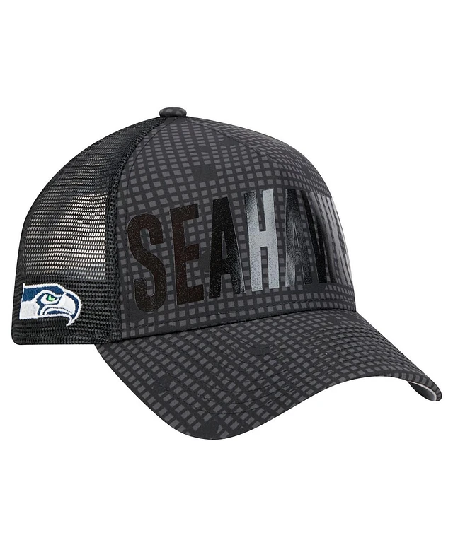 New Era Men's Black Seattle Seahawks Midnight Ink Tonal Text A-Frame Trucker 9FORTY Adjustable Hat
