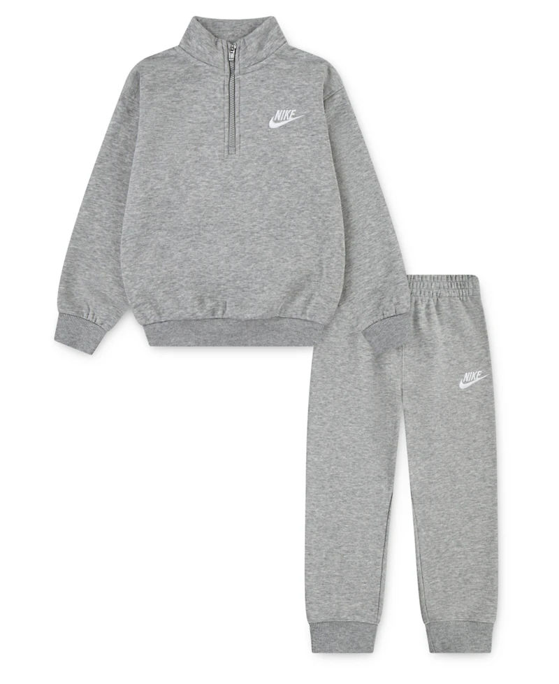 Keep little ones warm in this Nike two-piece set made from cotton/polyester fleece fabric. A quarter-zip closure on the top makes dressing easy and allows for temperature regulation. The matching pants feature a stretchy waistband for comfortable movement during play. This coordinated set provides cozy warmth for cooler weather activities.