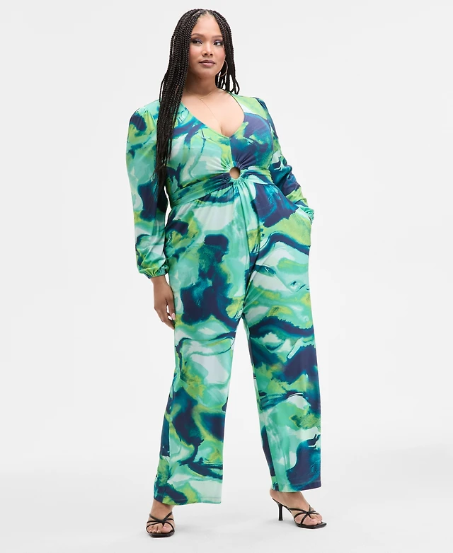 Nina Parker Trendy Plus Size Long-Sleeve Ring-Detail Jumpsuit