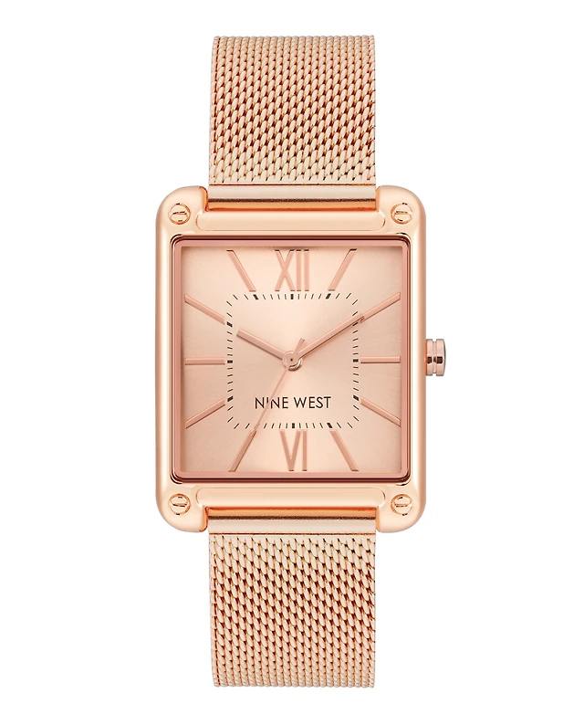 Nine West Women's Quartz Rectangular Rose Gold-Tone Stainless Steel Mesh Band Watch, 29mm