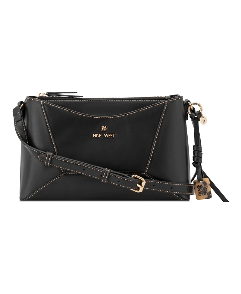 Nine West designer Zoey triple compartment crossbody with internal slip and zipper pocket organization and external hardware details, stitch details and branding. Adjustable crossbody strap for hands free ease.