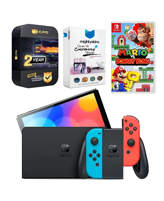 Nintendo Switch Neon Red & Blue Oled Console with Mario vs. Donkey Kong, MightySkins Console and Controller Skin Voucher, and 2 Year Cps Extended Warr