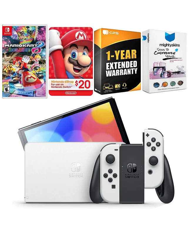 Nintendo Switch White Oled Console with Mario Kart 8 Deluxe, Nintendo $20 eShop Gift Card, MightySkins Console and Controller Skin Voucher