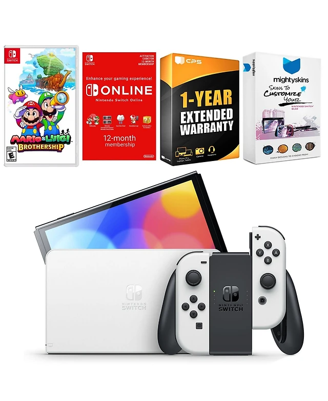 Nintendo Switch White Oled Console with Mario & Luigi: Brothership, Nso 12 Month Family Membership, MightySkins Console and Controller Skin Voucher