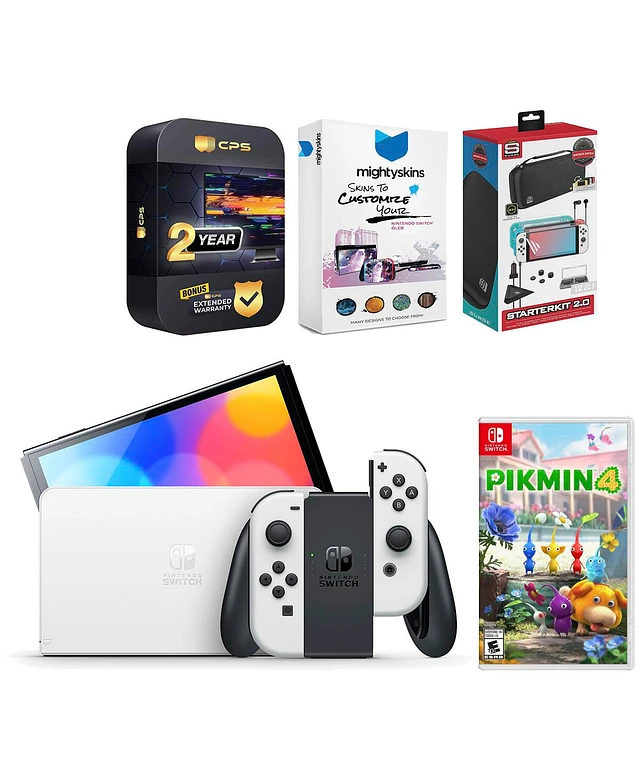 Nintendo Switch White Oled Console with Pikmin 4, Surge Accessory Gaming Kit, MightySkins Console and Controller Skin Voucher and 2 YearCPS Extended W