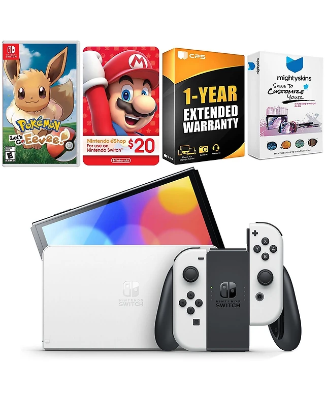 Nintendo Switch White Oled Console with Pokemon Let's Go, Eevee!, Nintendo $20 eShop Gift Card, MightySkins Console and Controller Skin Voucher