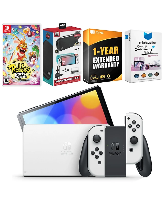 Nintendo Switch White Oled Console with Rabbids: Party of Legends, Surge Accessory Gaming Kit, MightySkins Console and Controller Skin Voucher