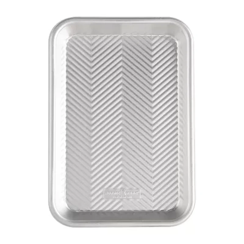 Embossed Natural Aluminum Bakeware enhances the look and performance of our hugely popular baking pans. Exclusive Prism grid adds durability and provides easy release while also improving air flow for uniform crisping. Prism Eighth Sheet is perfectly sized for food prep, serving burgers, and portions for 1-2, this textured eighth-sized sheet fits in toaster ovens and air fryers too. Made in the USA.