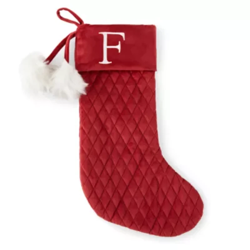 Add a special personalized touch to stocking displays for the holidays with this North Pole Trading Co. monogram style. Made from plush quilted velvet with faux fur pom poms, it also features your choice of an embroidered monogrammable initial.