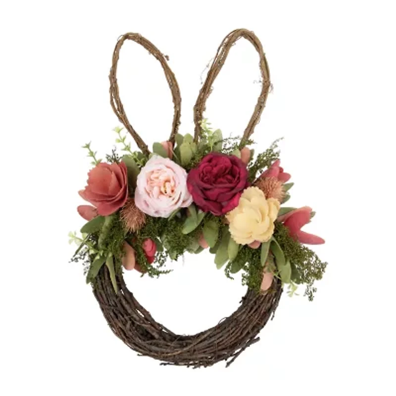 Welcome spring with this charming Easter bunny twig wreath that will add color and warmth to your home. Crafted from natural twigs the wreath features adorable twig bunny ears giving it a playful Easter rabbit design. Silk and delicate wood shaved flowers add a rustic elegant touch making it a versatile seasonal accent. Green foliage with wood shaved leaves surround the pink and peach flowers. It's an ideal Easter wreath for your front door or mantel bringing seasonal charm to your holiday decor. Product Features: Flowers made with real wood shavings. Easy to hang from the natural twigs. Recommended for indoor use. Dimensions: 15"H x 8.5"W x 3.25"D. Inner wreath diameter: 5.5". Material(s): wood/polyester.