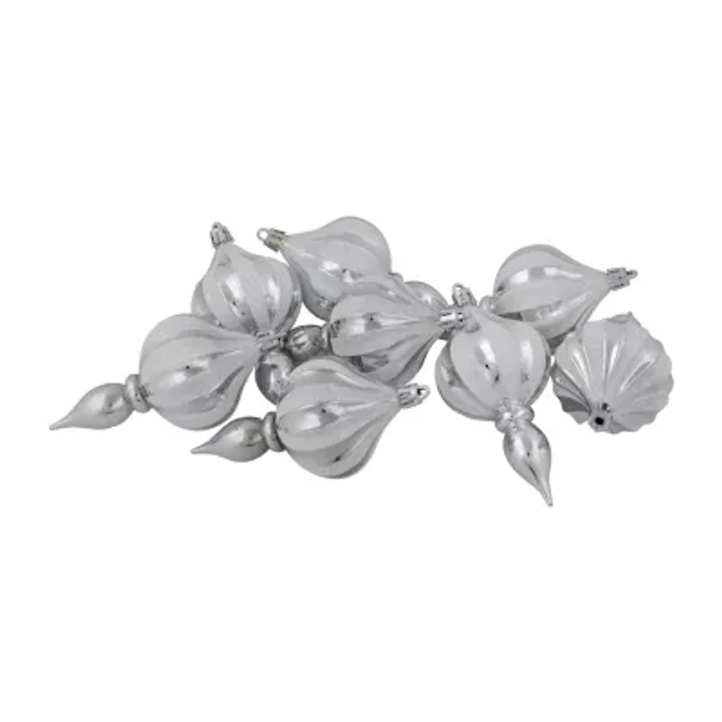 Finial ornaments are one of a kind. An unique shape with fun fresh colors. The ornaments are equipped with ornament caps and come ready to hang from an attached cord. The beautiful finish provides the perfect amount of glam to your tree. Shatterproof ornaments combine the beauty and luster of real glass with the unbreakable practicality of plastic. Product Features: 8-piece set. Color: silver. Finish: shiny. Fully dimensional ornament. Finials are equipped with ornament caps. Ornaments come ready-to-hang on included silver cords. Dimensions: 4.75" High x 2.5" Wide. Material(s): plastic