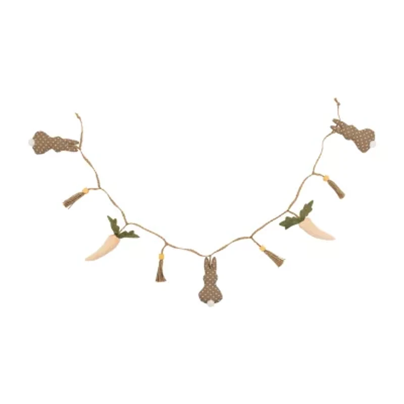 Add a touch of whimsy to your Easter decor with this adorable Easter garland. Measuring 4 feet in length this charming garland features soft plush bunnies with fluffy cottontails plush carrots and tassel and bead accents. Perfect for bringing a playful and festive atmosphere to your home this Easter season. Product Features: Plush Easter garland with jute cord. Neutral tones of brown peach and moss green. Braided cord adorned with brown bunnies and peach carrots. Accented with tassels and wooden beads. Loops on each end for easy hanging. Recommended for indoor use - if using outdoors place under a covered area. Dimensions: 4' long. Rabbits: 4.25" high x 2" wide. Carrots: 3.5" high x 1" wide. Material(s): fabric/jute.