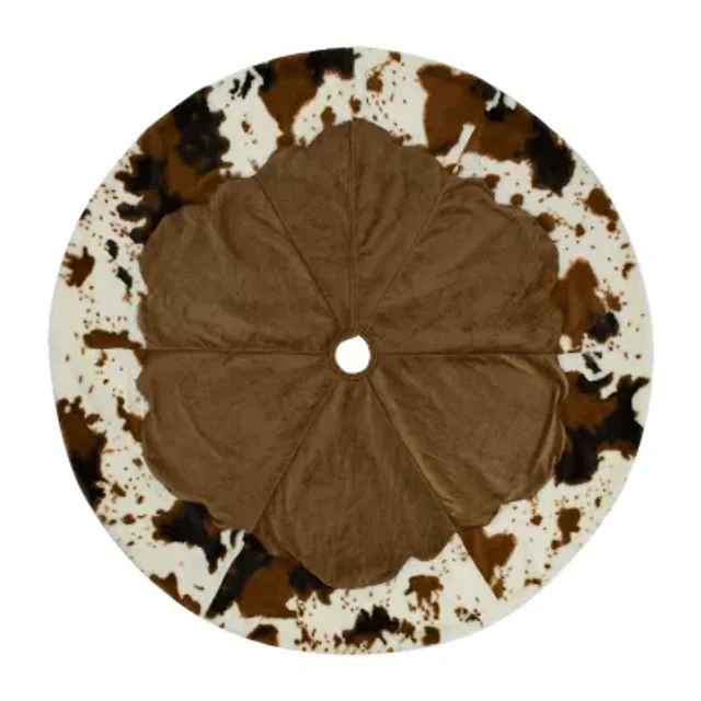 This unique tree skirt is a distinctive and cozy addition to your holiday decor, featuring a charming brown cowhide-inspired look. This skirt seamlessly combines the rustic appeal of corduroy with the luxurious touch of faux fur trim, creating a warm and inviting ambiance around your christmas tree. Elevate your christmas celebrations with this unique and inviting tree skirt, setting the stage for cherished moments and beautiful memories. Product features: brown corduroy tree skirt. Trimmed in a cowhide inspired faux fur. Closes in the back with a hook and loop fastener. Recommended for indoor use only. Dimensions: 48" diameter. Material(s): polyester.
