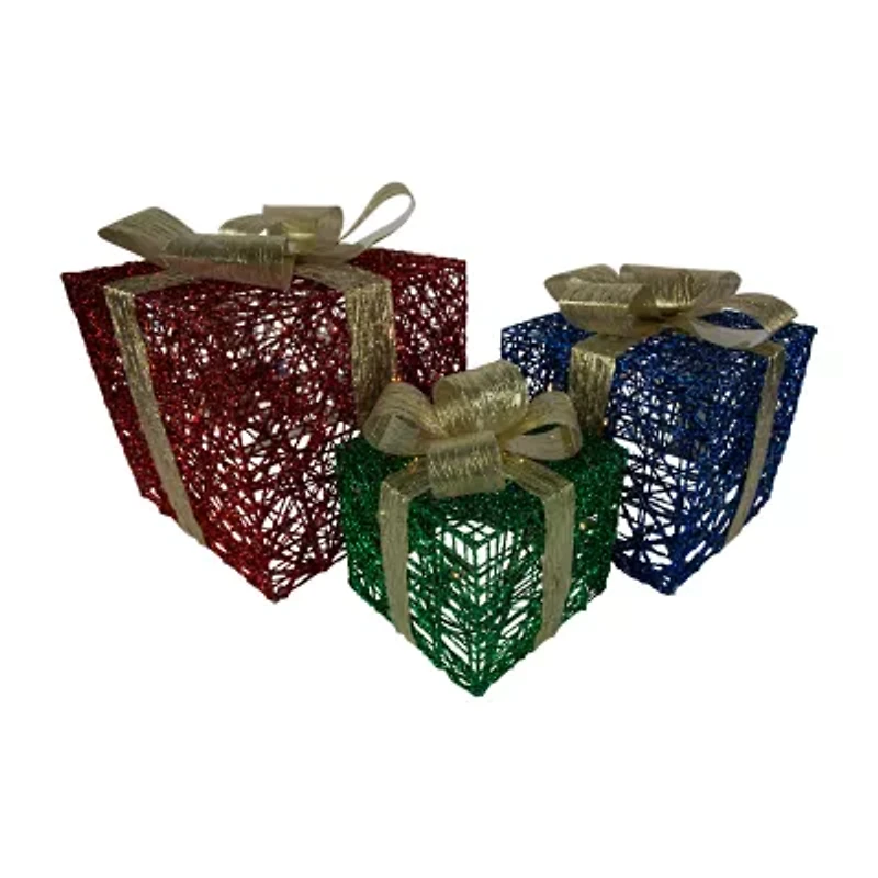Get into the holiday spirit with This gift box set This set features elegant-looking pre-lit gift boxes in red blue and green they are accented with yellow bows these will be the perfect addition to your porch entryway tabletop or anywhere you wish to add a little holiday charm product features: Christmas gift boxes decoration pre-lit with 40 clear lights bulb size: mini bulb type: incandescent if one bulb burns out the rest will stay lit contains 1 plug with an end connector which allows you to stack multiple lighted items together (210-watt max) comes with replacement bulbs and spare fuses some assembly required; ground stakes not included ul approved and certified for indoor or outdoor use recommended for outdoor use lights per box: small: 10 lights medium: 10 lights large: 20 lights dimensions: small: 6"h x 6"w x 6"d medium: 7.75"h x 7.75"w x 7.75"d large: 9.75"h x 9.75"w x 9.75"d material(s): fabric/plastic/metal set includes 1 of each item shown totaling 3