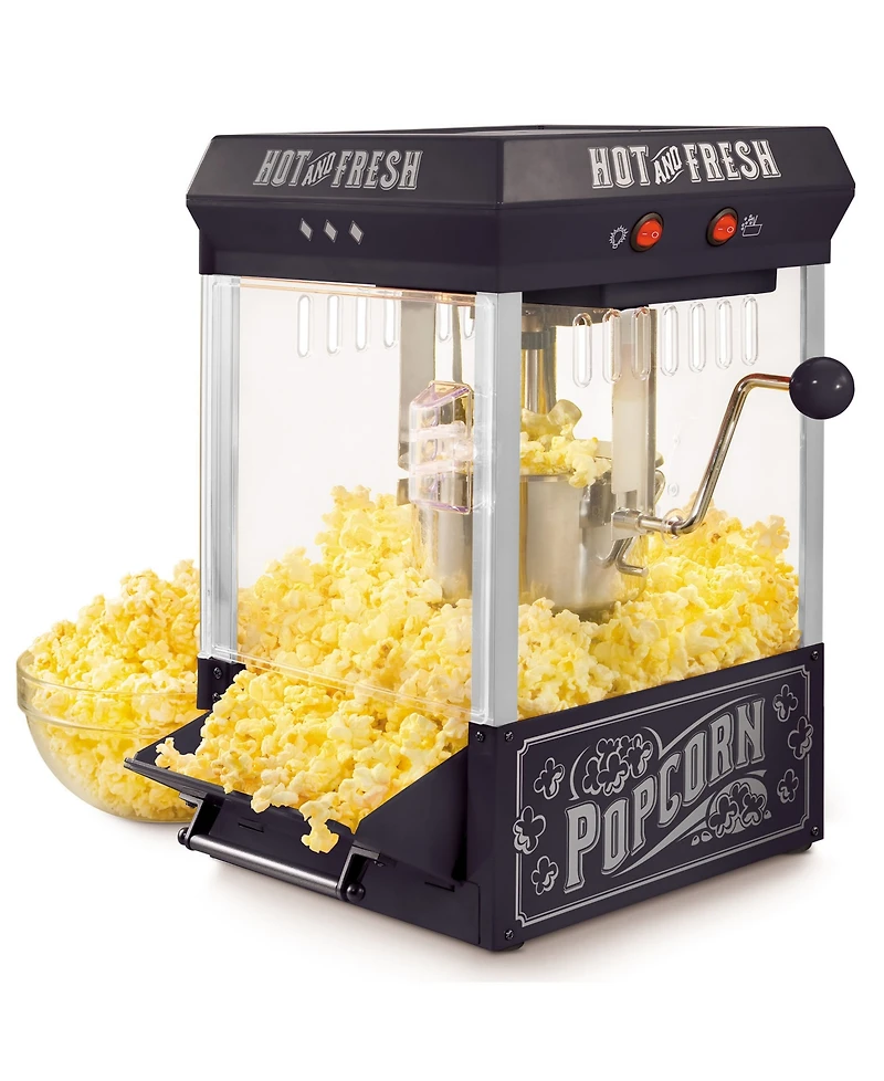Bring the family together for movie night with its vintage look reminiscent of the silent movie house and carnivals of the 1900s. The large 2.5-ounce kettle with dual-hinged lid and built-in stirring system pops delicious crunchy popcorn. Featuring tempered glass windows and door, a lighted interior allows you to watch each batch pop to perfection. The tilt door allows for easy access serving. Popcorn has never tasted so good at home.