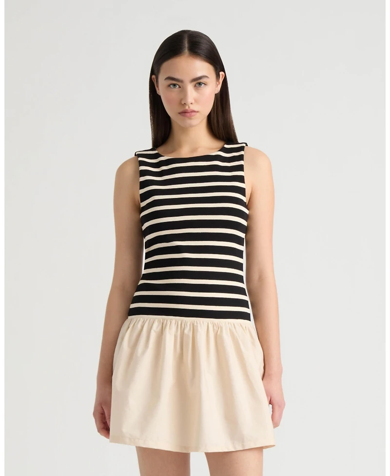 Crafted with a clean boat neck and streamlined pull-on design, this sleeveless twofer dress delivers easy sophistication. The ruffled poplin skirt introduces soft volume, and the stripe pattern completes the look with a subtle, elevated finish.