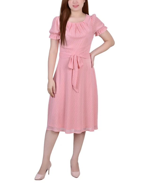 Ny Collection Petite Short Sleeve Belted Swiss Dot Dress