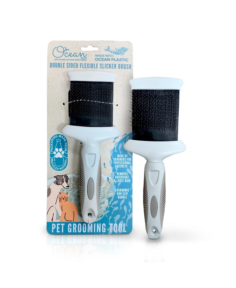 Maintain your pet's coat with the Ocean Plastic by Pt Double-Sided Flexible Slicker Brush, an eco-friendly grooming tool crafted from recycled ocean plastic. Available in Beige, Blue, and Gray, this sustainable brush is perfect for searches like 'eco-friendly pet grooming tools' and 'flexible slicker brush for dogs and cats.' The dual-sided design features flexible bristles that gently remove tangles, loose fur, and dirt, making it ideal for 'double-sided pet slicker brush' and 'gentle detangling brush for pets' queries. Suitable for dogs and cats of all coat types, this brush promotes a shiny, healthy coat while being kind to your pet's skin. With its durable construction and environmentally conscious design, this flexible slicker brush is a must-have for pet owners seeking effective and sustainable grooming solutions.