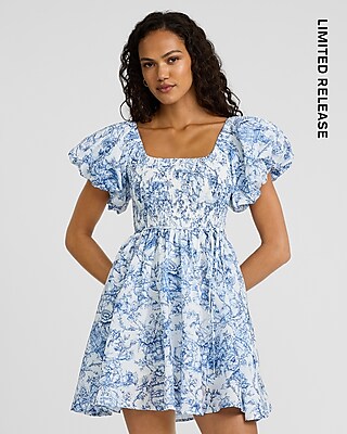 Printed Square Neck Puff Sleeve Mini Fit and Flare Dress