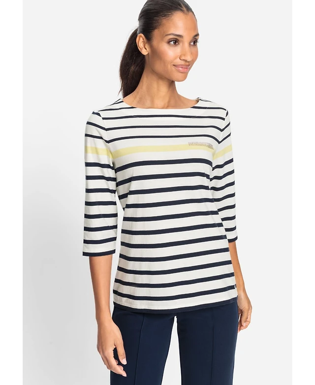 Olsen Women's Striped Embroidered Trim V-Neck Tee