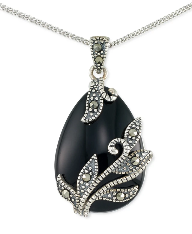 Onyx & Marcasite (1/2 ct. t.w.) Teardrop Pendant Necklace in Sterling Silver, 18" + 2" extender