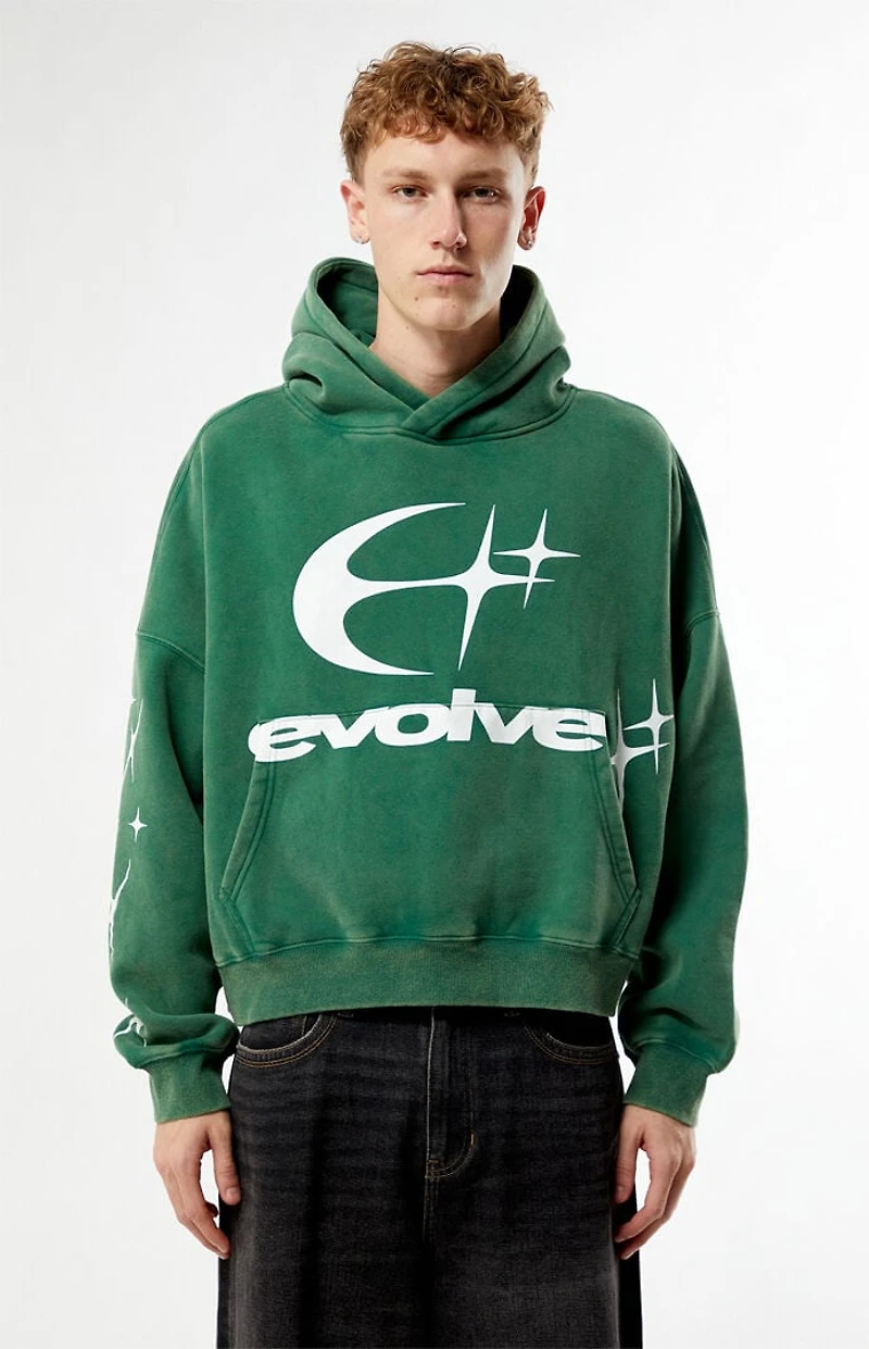 The Evolve Cropped Hoodie from Pacsun brings an edgy twist to your everyday look. Made from vintage wash fabric, it features an attached hood, long sleeves with dropped shoulders, front graphics, a kangaroo pocket, and a cropped fit.