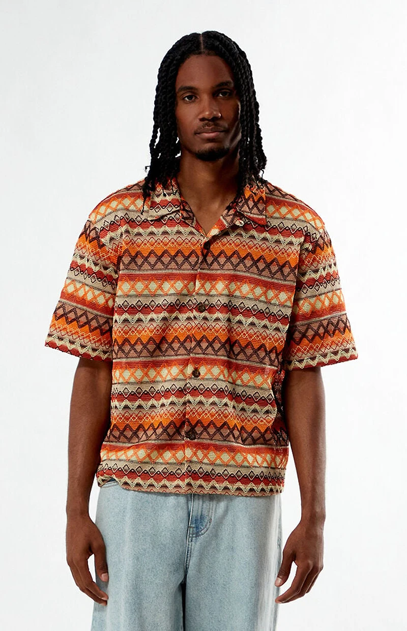The Silas Oversized Camp Shirt from PacSun delivers effortless texture and breezy style. This oversized shirt features a distinct pattern, classic camp collar, short sleeves, and a button-down front closure for a relaxed yet statement-making look.