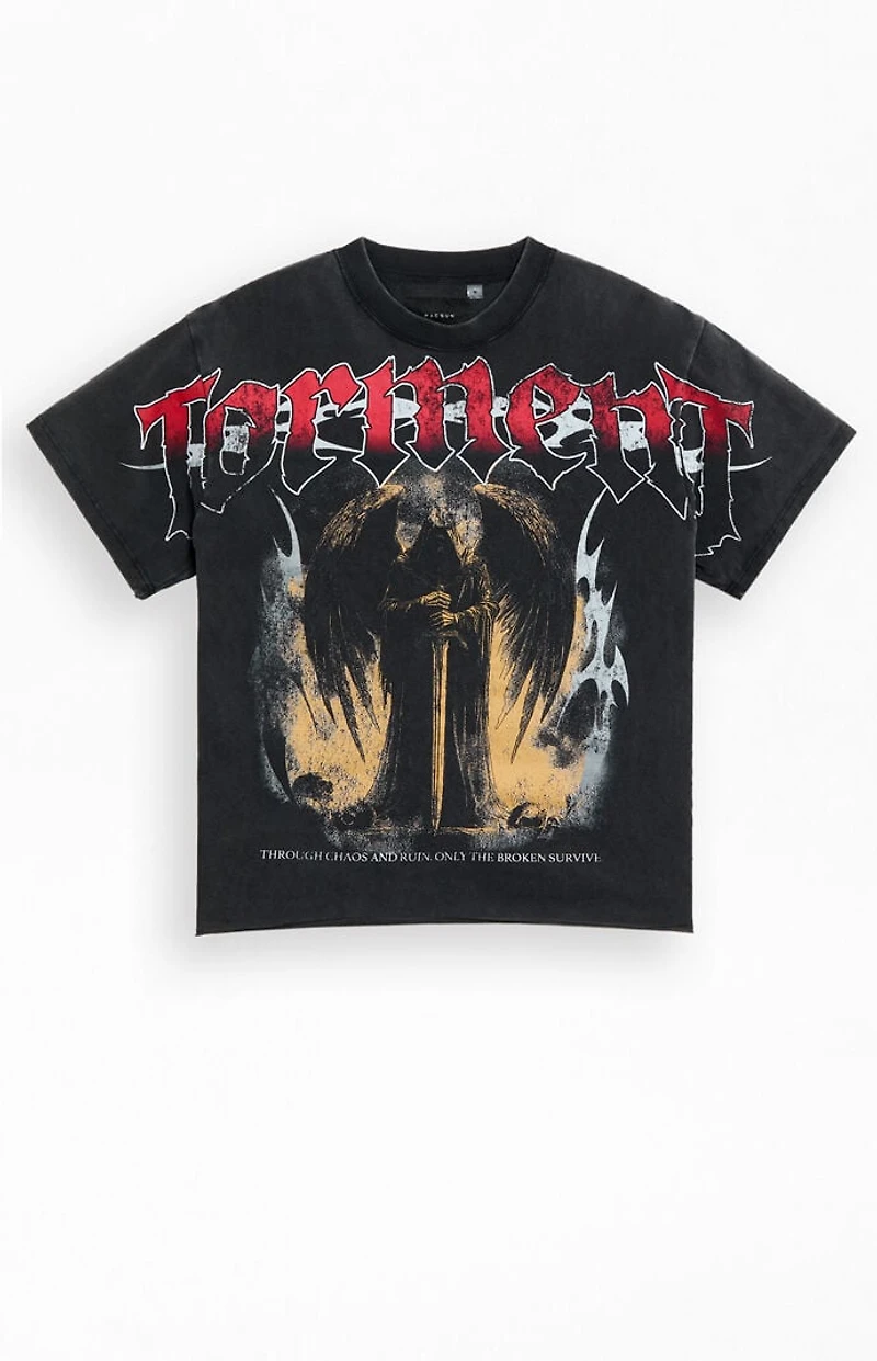 The Torment Chaos Cropped Boxy T-Shirt offers a vintage-inspired look with a modern edge. Made from vintage wash fabric, it features short sleeves, a crew neckline, bold graphics on the front, and a trendy cropped fit.