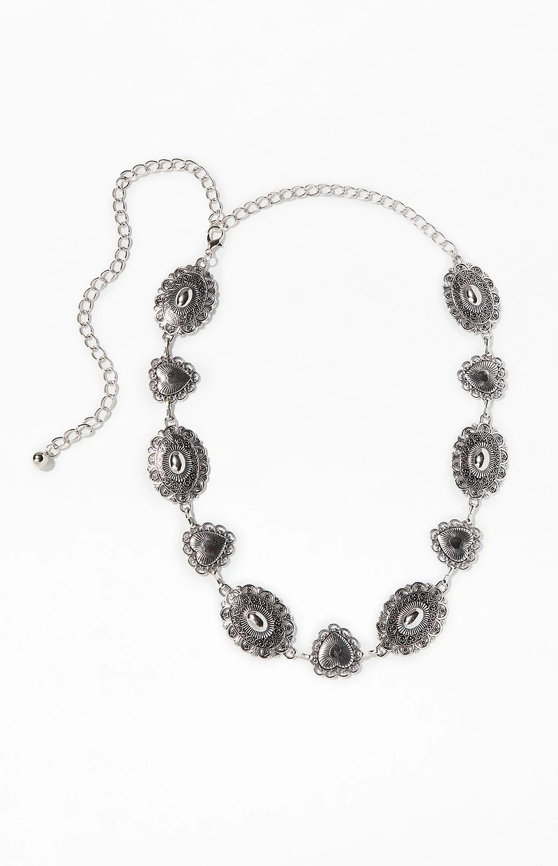 The Western Heart Chain Belt from LA Hearts brings a bold, trendy edge to your outfit with a fresh, youthful vibe. Featuring detailed silver-tone hearts and conchos linked together on an adjustable chain, this belt is perfect for adding a statement touch to dresses, jeans, or shorts.