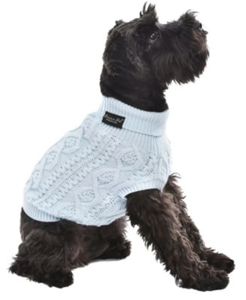 Soft and sweet. The Cable Knit Dog Sweater in powder blue offers classic style and cozy warmth. This stretchable, chunky knit pullover is perfect for keeping pets snug in the cold.