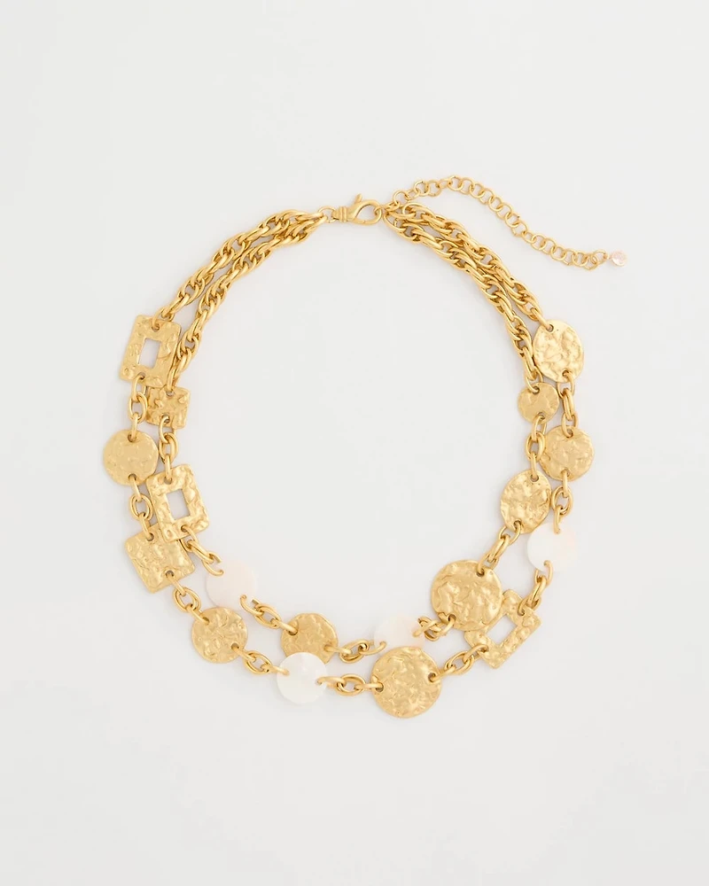 Debuting as part of our Treasure Cove Gold Collection, this necklace features genuine mother of pearl united with a medley of textured shapes to create a must-look short, double-strand necklace.
