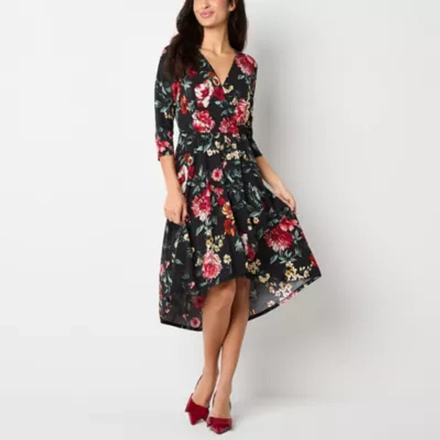 Perceptions Womens 3/4 Sleeve Floral High-Low Fit + Flare Dress