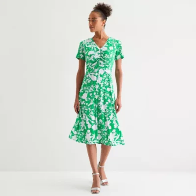 Perceptions Womens Short Sleeve Floral Midi Fit + Flare Dress