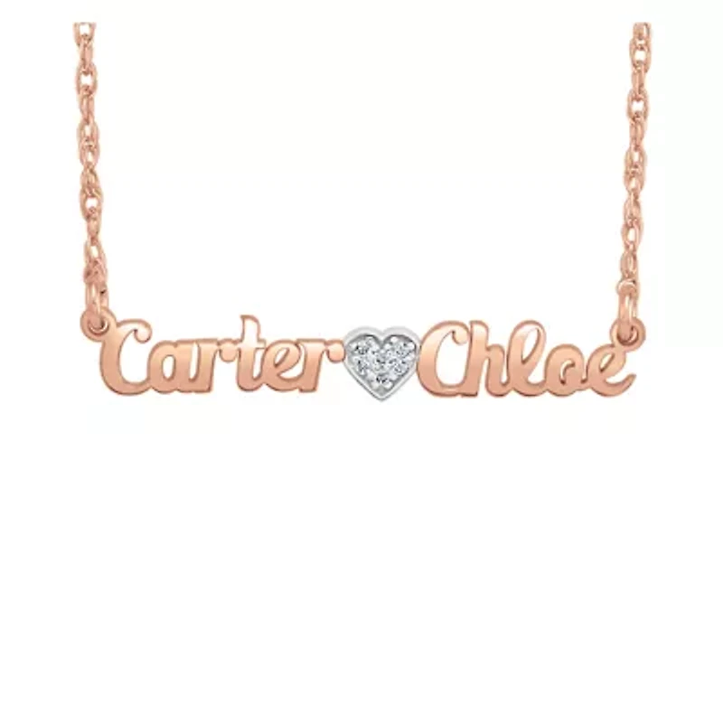 You'll love this personalized couple's name pendant necklace for celebrating love. Made from Sterling Silver, it features a nameplate to personalize with two names joined by a heart-shaped pendant accented with small round-cut genuine diamonds. It comes complete on a rope chain - gift it to yourself or a loved one for an anniversary or special occasion.
