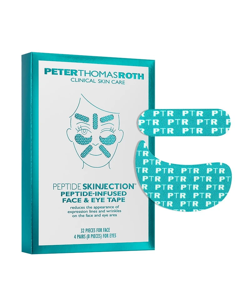 Target expression lines and under-eye wrinkles with this Peter Thomas Roth peptide skinjection face and eye tape set, infused with peptides, niacinamide, and caffeine for visibly smoother, firmer-looking skin. Oval and wing-shaped tapes deliver clinically tested results in as little as two hours, reducing the appearance of fine lines, crow's feet, and puffiness while promoting a brighter, more even-toned complexion.