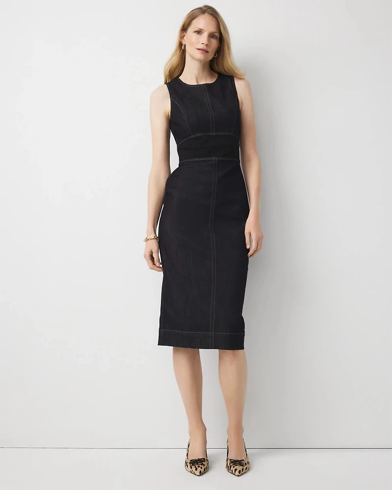 We’ve updated your favorite go-to work dress in denim. It's designed with princess seams and a Ponte panel at the waist for a modern fit. It’s also sleeveless, making it perfect to layer under a blazer.