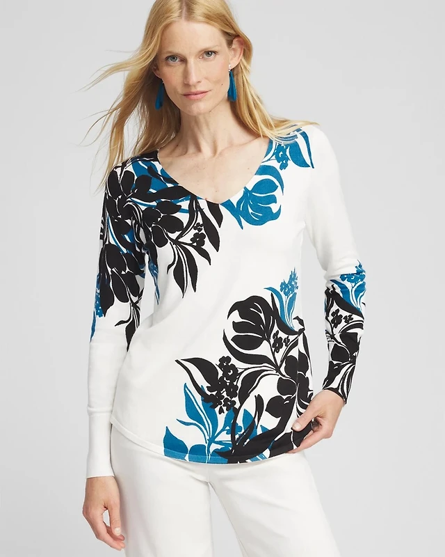 Placed Floral Print V-neck Pullover Sweater