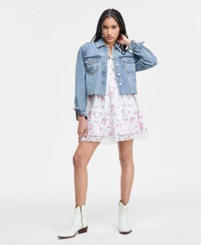 Lucky Brand Womens Cotton Denim Trucker Jacket Sweetheart Neck Cinched Bodice Mini Dress