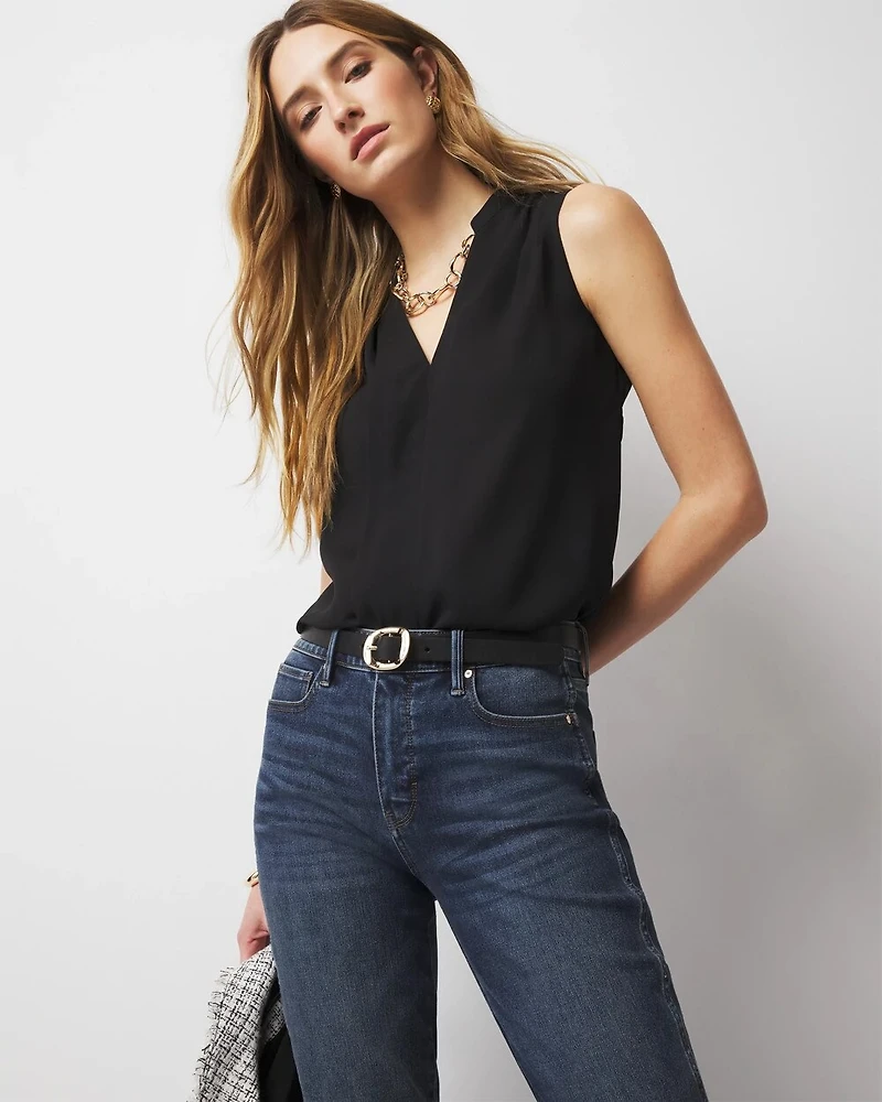 Instantly elevate your work wardrobe with this feminine sleeveless top. Designed with pleat details down the center front, this shell is made from a fabric with a slight sheen for added polish. Layer under a blazer.