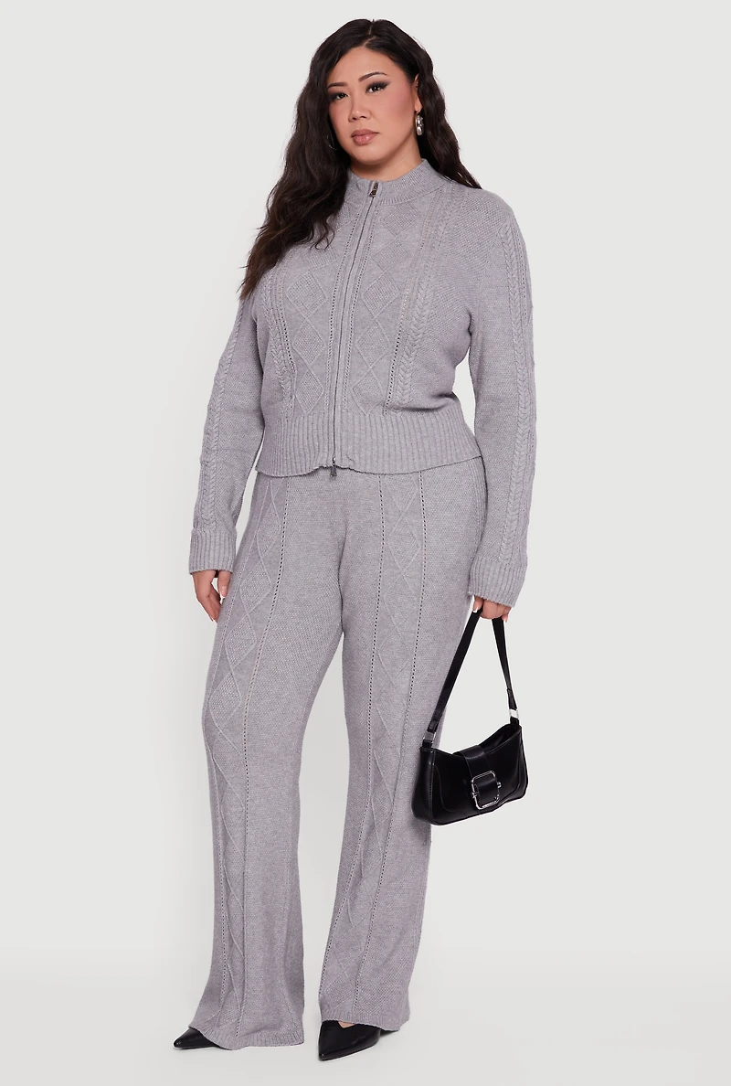 Step into cozy comfort with the Plus Size Almost Famous High Waisted Cable Knit Pants. These casual wide-leg pants are designed to flatter your curves while keeping you effortlessly stylish. The high waist offers a flattering silhouette, and the pull-on design makes them easy to wear all day long. Featuring delicate pointelle detail, these pants bring a touch of texture and charm to your loungewear collection. Whether you're relaxing at home or running errands, these pants combine comfort and style in one perfect package.