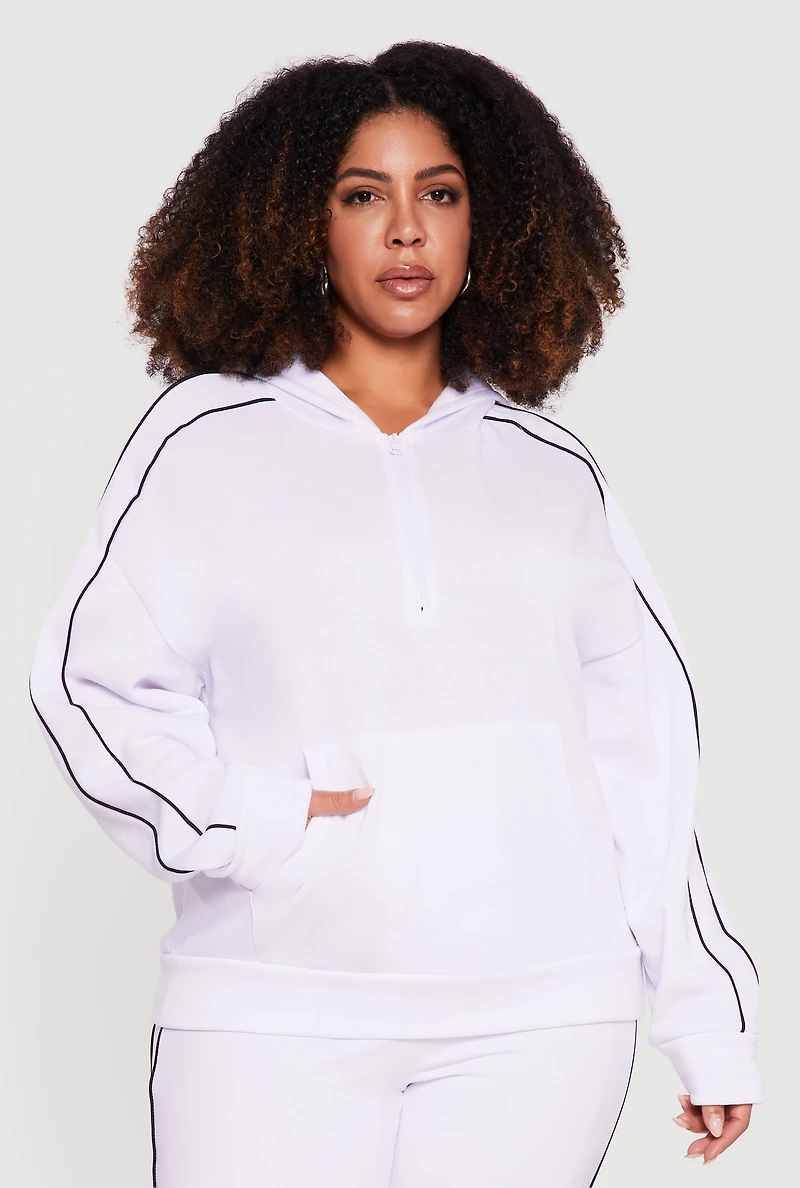 Step up your casual game with this Plus Size Contrast Piping Kangaroo Pocket Pullover Hoodie. Designed for ultimate comfort and effortless style, this fleece hoodie features a classic fit that flatters your curves while keeping you cozy. The quarter zip front and hooded neckline add a sporty edge, and the contrast piping detail gives it a fresh, modern twist. Perfect for lounging, running errands, or casual hangouts, this hoodie is your new go-to for laid-back vibes with a stylish flair.