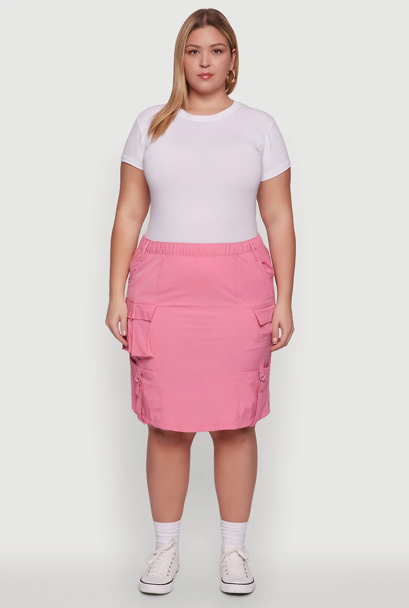Step up your style game with our Plus Size Nylon Pull On Utility Skirt with Elastic Waist. Designed for comfort and versatility, this mid-length skirt features a high waist and easy pull-on style that moves with you. Perfect for casual outings or dressing up for a night out, its utility design with cargo pockets adds a trendy edge to your wardrobe. Feel confident, comfortable, and effortlessly chic in this must-have piece that celebrates your curves and your style. Pull On design for easy wear and removal Elastic waistband provides a flexible, comfortable fit Utility style with cargo pockets for a functional, fashionable look High waisted for a flattering silhouette Mid-length hem offers versatile styling options Made from durable nylon for long-lasting wear Model Pictured Wearing Size 1X Fits True To Size Measurements Full Length: 23 in Content and Care Material: 90% Nylon, 10% Spandex Care Instructions: Machine Wash, Tumble Dry Country Of Origin: Bangladesh Rainbow Item Number 1862038346262 PINK - 1862038346262066