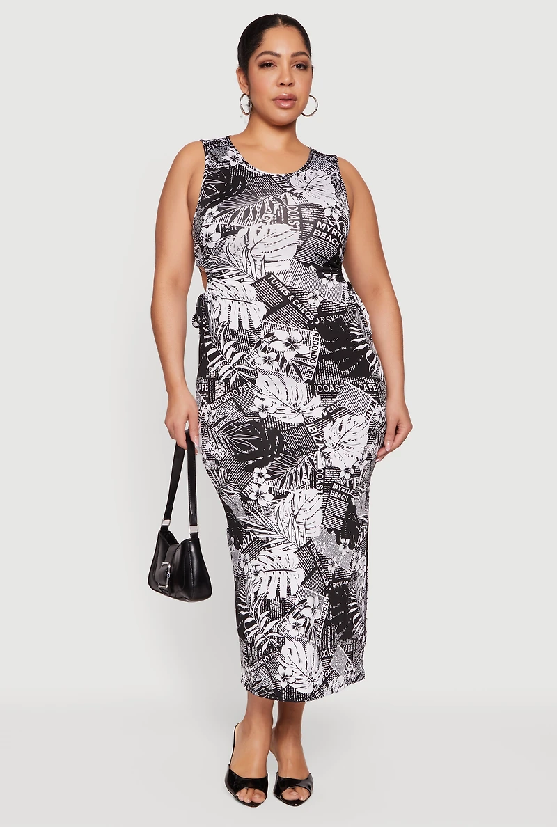 This plus size midi dress features a classic fit with a flattering scoop neckline and sleeveless tank style. Side slits and adjustable drawstring keyhole details add a modern twist to its timeless silhouette. Perfect for night outs and parties, it combines style and ease for confident wear.